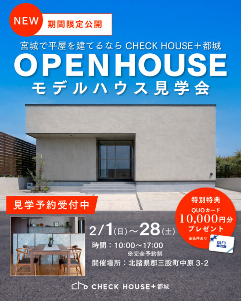 イベント情報 チェックハウスプラス 都城 お知らせ CATEGORY カテゴリー イベント情報 チェックハウスプラス 都城 お知らせ ブログ 2026. 01.29 宮﨑で平屋を建てるならチェックハウス都城|平屋モデルハウス見学会 2025. 11.13 “毎日が、リゾートになる。”デザイン住宅相談会 2025. 10.23 【11/15㊏16㊐22㊏23㊐24㊗】平屋見学会開催! 2025. 10.15 秋の建築応援キャンペーン開催 2025. 09.26 住まいのデザイン診断会開催! 2025. 08.12 GRAND OPEN キャンペーン開催! 2025. 08.01 【終了しました】都城スタジオ8月イベント 2025. 03.28 住宅に関する無料相談実施中
