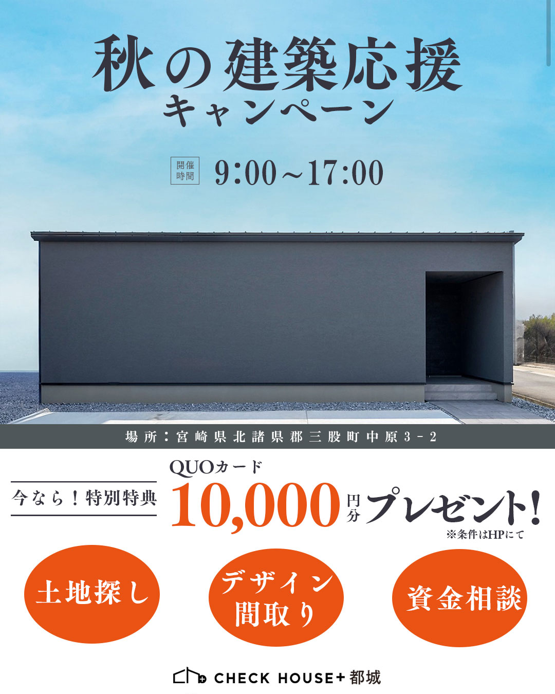 『期間中チェックハウスプラス都城スタジオへご来場いただき特約条件をクリアしていただいたお客様へは10000円のクオカードを差し上げます!!』